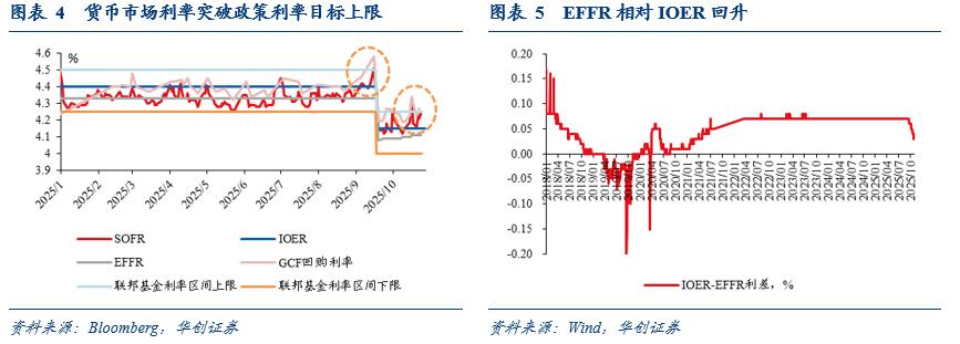 1)货币市场回购利率相对于联邦基金利率已经上升,并且在特定日期(比如9月15日的公司纳税截止日期)出现了更显著的流动性紧张的压力。从9月中旬以来,GCF回购利率和SOFR利率持续走高,并突破联邦基金利率目标上限。