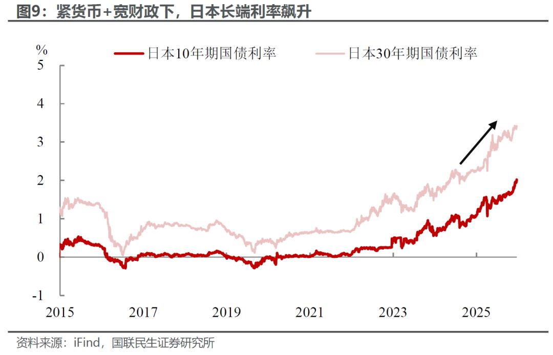 但日央行可能顾忌的更多,这可能导致其政策节奏落后于曲线。植田和男当前正面临“紧货币”与“宽财政”的政策矛盾:为应对持续高企的通胀,央行不得不被迫加息;而高市早苗政府推行的大规模财政扩张政策,又导致日本政府债务压力快速攀升,双重因素共同作用下,国内长端利率居高不下。日央行在抑制通胀与维护市场稳定之间陷入两难抉择,这可能会导致日央行后续的货币政策调整不及预期,有落后于曲线的风险。