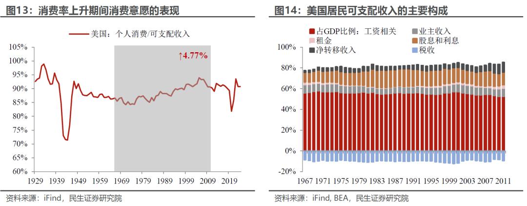 收入的大幅增长是打通生产和消费的重要环节。1920年代美国消费繁荣的背后,居民可支配收入的提升发挥了重要的稳定作用,其占GDP的份额快速上升。