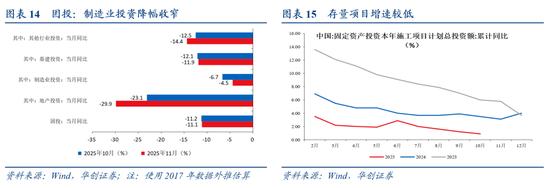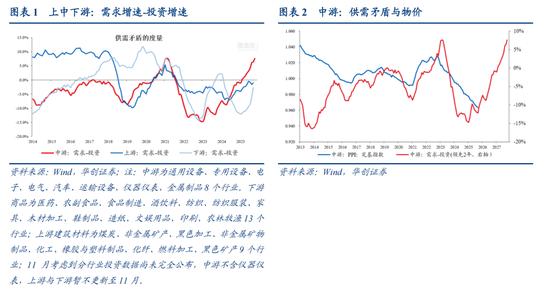 再次,介绍当前观察的现象。11月,对于中游,尽管需求增速小幅回落,以滚动一年来看,11月中游需求增速为8.9%,低于10月的9.3%以及9月的10.3%(回落原因与耐用品消费增速回落有关)。但,中游投资同样在持续回落,11月(仪器仪表投资增速尚未公布,此处中游投资不含仪器仪表),滚动一年的中游投资增速为1.3%,低于10月的2.9%以及9月的4.2%。以需求-投资来看,中游在11月进一步上行至7.6%,前值为6.4%,自2024年5月开始持续上行,自2025年3月开始增速差转正。而上游与下游,由于分行业投资数据已公布的较少,观察到10月的情况,上游需求与投资增速差为-1.0%,下游为-2.8%,均未超过0。