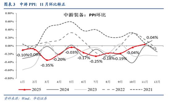 最后,介绍我们的推演。从历史数据来看,中游需求与投资增速差持续回升,且增速差能回升至0以上,有希望看到在未来2年的时间段内,中游PPI定基指数止跌回升(即,价格止跌)。我们预计,2026年很有可能看到中游PPI定基指数止跌上行。事实上,从2025年11月的数据来看,中游PPI环比出现了久违的环比转正(2024年6月以来第一次出现)。11月,中游PPI环比为0.04%,10月为-0.04%,9月为-0.19%。若中游PPI定基指数止跌,中游PPI同比有望持续上行,中游ROE将向上运行。
