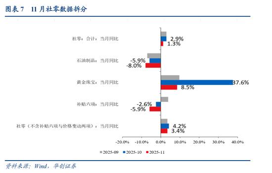 2)价格波动较大的两项,本月增速有所回落。11月,石油及制品增速为-8%,前值为-5.9%。金银珠宝,11月增速为8.5%,前值为37.6%。